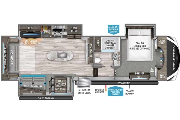 Luxurious space and comfort! The Reflection 337RLS offers spacious rooms, a beautifully appointed kitchen, tons of storage, and residential quality furniture. You'll love the 40" TV directly across from reclining sofa, the 30" by 48" shower, one-touch leveling, two power awnings and so much more!