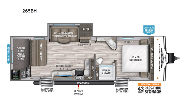 Your family will love the space and the amenities while camping at all of your favorite places in this new Transcend Xplor travel trailer. There is plenty of sleeping space with double-size bunks in back and a queen-size bed in the front private bedroom. You can also use the jackknife sofa and U-shaped dinette for added sleeping for more overnight guests. Two entry doors in this unit make loading and unloading simple, plus the second entry door into the front master bedroom is great for slipping out for a morning walk or coffee under the 16' power awning without disturbing the kids while they are asleep in the bunk space in back.