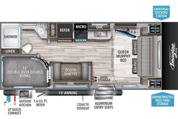 There's so much to love about this bunkhouse! At less than 6,000 pounds gross weight it is can be towed by many lighter trucks and SUVs, but it comfortably sleeps up to eight. You'll have the perfect campsite with the 15' power awning and nicely equipped outdoor kitchen, and inside you'll love the double bunks, roomy bathroom, and modern appliances. There is a front queen Murphy bed that swings up easily during the day and is ready for sleep with just a pull of the handle. Built and backed by Grand Design, you know this is a quality camper that is destined to become a classic.