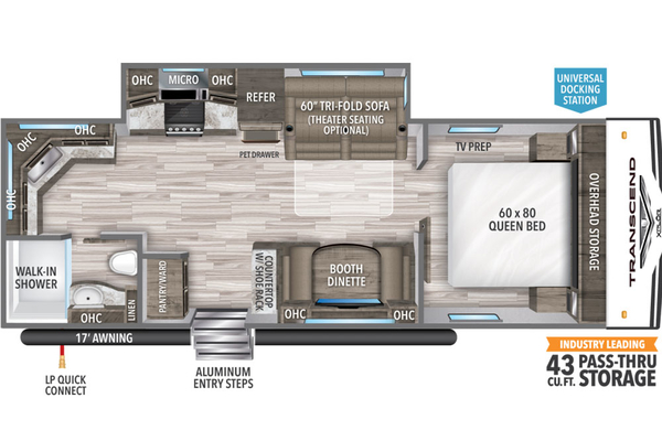 One of the first things you will notice about the Transcend XPLOR 240ML is the convenient shoe rack and storage near the entrance, but that is just one example of the extensive storage options on this trailer. There is a large pantry/wardrobe, lots of kitchen cabinet storage and eight drawers, cubby hole and cabinet storage in the bathroom and much more! You'll love the roomy shower, residential queen size bed, and comfortable theater-style seating in the living area (or optional trim-fold sofa). Come see this spacious travel trailer!