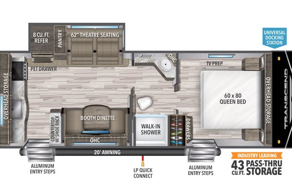 The Transcend XPLOR 231RK has so much to offer! As you walk in the front door you will see a cabinet with drawers and cubby storage, perfect for shoes and other items. On the left there is a long kitchen counter, deep basin stainless steel sink, and lots of drawers for storage. The kitchen also offers pantry storage and spice rack. The living area offers a reclining theater-style sofa that faces the TV and large slide for extra floor space. The bathroom is a walk-thru with roomy shower on one side and vanity with extended counter on the other. The bedroom features a residential queen size bed (no need for special RV sheets!), private exterior entrance and lots of storage with the two shirt wardrobes and additional closet with drawers. Come see this fantastic rear kitchen trailer today!