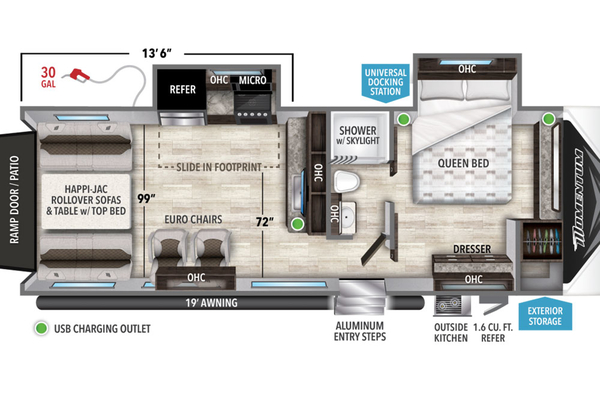 The Grand Design Momentum 25G is a beautiful toy hauler with amenities that make it as comfortable as it is durable. There is a 13' 6" garage with ramp that double as a patio and Happi-Jac bunk system with convertible booth-style dinette. The front bedroom has a bed slide that opens up the room, and the bathroom features a roomy walk-in shower. You'll love the spacious kitchen countertops and modern appliances, and there is an outdoor kitchen, too. Built by Grand Design, the Momentum is backed with their fantastic customer service and solid warranty. Come see it today!
