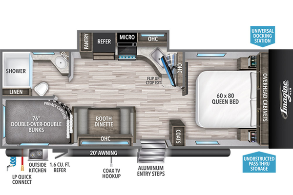 Have a look at this wonderful bunkhouse travel trailer! Compact in size but spacious and well-appointed, the Imagine XLS 23BHE offers double bunks, roomy bathroom with large shower, tons of storage, an outdoor kitchen and much, much more!