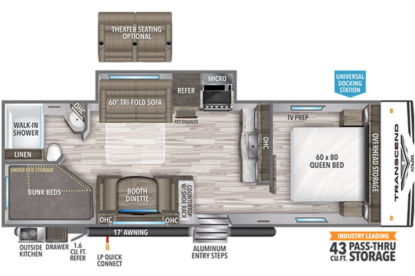 The Transcend XPLOR 261BH features a large slide that opens up the living and kitchen area to create a spacious home away from home. The front bedroom offers a sliding door for privacy and features a residential queen size bed. There is a spacious walk-in shower in the bathroom, and kitchen has lots of counter space. You'll love the cubby storage near the front door that helps cut down on clutter, and the outdoor kitchen has a refrigerator and two-burner stove top.