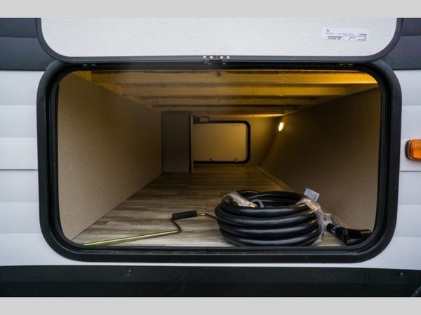 Head to the lake for unforgettable camping trips in this dual entry travel trailer. The private bunkhouse suite includes four bunks, two drawers to store belongings, plus a half bath for convenience. Everyone will love to gather in the main living area that includes theatre seating, a booth dinette, plus a 32" LED TV on a swing arm for a perfect view. You'll find plenty of storage space, including a wardrobe/pantry, a broom closet, plus plenty of overhead compartments for your valuables. This model also includes a full indoor kitchen, as well as an outdoor kitchen with a two burner cooktop, an exterior spray port, plus a 1.6 cu. ft. refrigerator for cold drinks.