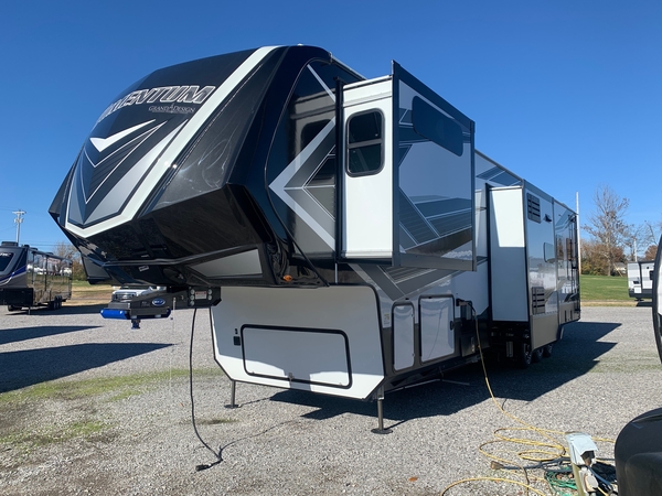 Air Conditioning +Air Conditioning (BTUs)30000Air Conditioning TypeAutomaticAwning +Awning Length (ft)36Number of Awnings3Power Retractable AwningBathroom +Bathroom Flooring TypeVinylBathroom LocationCenterNumber Of Bathrooms2Bathroom Medicine Cabinet +Bathroom Medicine Cabinet LocationCenterBathroom Mirror +Bathroom Mirror LocationCenterBathroom Sink +Bathroom Sink LocationCenterBathroom Vent / Fan System +Bathroom Vent / Fan System LocationCenterBattery +Battery Power ConverterBeds +Max Sleeping Count9Number Of Bunk Beds1Number Of Queen Size Beds1Brakes +Front Brake TypeNot ApplicableRear Brake TypeElectric DrumCargo Area Auxiliary Gas Tank +Cargo Area Auxiliary Gas Tank Capacity (gal)60Cargo Area Dimensions +Cargo Area Flooring TypeRubberCargo Area Length (in)150Cargo Area Rear Door +Cargo Area Rear Door StyleRamp DoorConstruction +Body MaterialAluminumSidewall ConstructionFiberglassDimensions +Height (in)161Length (ft)43'Doors +Number of Doors2Heater +Heater (BTUs)35000Heater TypeAutomaticHolding Tanks +Number Of Black Water Holding Tanks1Number Of Fresh Water Holding Tanks1Number Of Gray Water Holding Tanks1Total Black Water Tank Capacity (gal)104Total Fresh Water Tank Capacity (gal)155Total Gray Water Tank Capacity (gal)104Interior Decor +Interior Wood FinishWallpaperKitchen / Living Area +Kitchen / Living Area Flooring TypeCarpet / VinylKitchen LocationCenterKitchen Table ConfigurationChairsLiving Area LocationCenterLeveling Jacks +Leveling Jack TypeFront Power / Rear PowerMaster Bedroom +Full Size Master Bedroom ClosetMaster Bedroom Door StyleConventional DoorMaster Bedroom Flooring TypeVinylMaster Bedroom LocationFrontMaster Bedroom Mirror DoorsMaster Bedroom Shades / CurtainsMicrowave Oven +ConvectionOven / Stove +LayoutOven / StoveNumber Of Oven Burners3Overhead FanPrewiring +Air Conditioning PrewiringBack-Up CameraCable PrewiringHeat PrewiringSatellite PrewiringSolarTV Antenna PrewiringWasher / Dryer PrewiringPropane Tank(s) +Number Of Propane Tanks2Total Propane Tank Capacity (gal)14.2Radio +Number Of Radios1Recliners / Rockers +MaterialVinylNumber Of Recliner / Rockers2Refrigerator +Refrigerator Power ModeElectric / PropaneRefrigerator SizeFull-SizeShower +Door TypePlastic / GlassShower LocationCenterSlideouts +Number of Slideouts3Power Retractable SlideoutSpare Tire +Spare Tire LocationExterior MountedSpeakers +Speaker Location(s)Interior / ExteriorTelevision +Number Of Televisions3Tires +Rear Tire (Full Spec)17.5 H Rated Cooper TiresRear Tire Speed RatingHRear Wheel Diameter17.5Tire BrandCooperToilet +Toilet LocationCenterToilet TypePorcelainWater Heater Tank +Water Heater Pump Power ModeElectrical / PropaneWater Heater Tank BypassWater Heater Tank Capacity (g)12Weight +Dry Weight (lbs)15600GVWR (lbs)20000Hitch Weight (lbs)3375Payload Capacity (lbs)4400Wheels +Number Of Axles3Wheels CompositionAluminumWireless / Connectivity +Bluetooth® AudioMobile App Instrumentation
