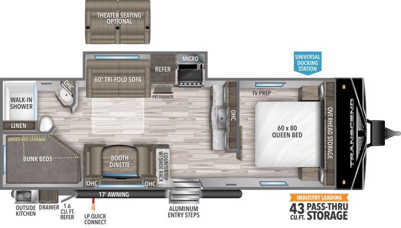Grand Design's Transcend continues our pursuit of building around the needs of our customers. Where others surrender quality, function and features, Transcend focuses on the needs of consumers --- open floorplans, functional design, and towable with many of today's half-ton trucks and SUVs. Transcend: Quality Driven, Customer Focused, Built to Last.