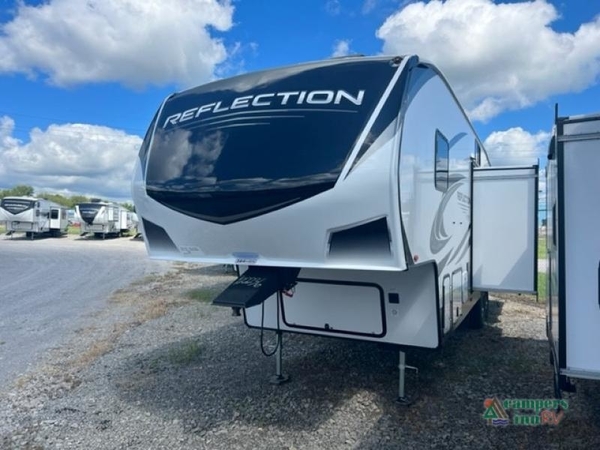 With any Reflection fifth wheels by Grand Design, you will have a 165W solar panel for off-grid camping and a 50 Amp charge controller and inverter prep, a Max Turn radius front cap for easy towing around town and into your campsite, a Universal All-In-One Docking Station, unobstructed pass-through storage, and Goodyear E-rated tires. Some other top features include a chef's kitchen with a 30" stainless steel microwave and residential cooktop, a USB charging station, and the ductless "Evenflow" heating system with no vents in the floor to collect debris. Each is constructed of high gloss gel coat exterior sidewalls, residential 5" truss rafters, walk-on roof decking, a fiberglass and radiant foil roof and front cap insulation plus laminated aluminum framed side walls, rear wall, roof and end walls in slide rooms. Choose luxury, value and towability over all the others, take home a Reflection of your good taste!