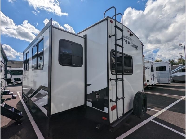 With this Imagine travel trailer, you can work while you're on the road because it offers you a desk in the main living area. You won't have to miss out on the action since you'll be right next to the booth dinette and tri-fold sofa, and there is even a pantry directly to the left of the desk for you to grab a quick snack while you're working. Once you're done with work, you can relax on the tri-fold sofa while you watch the telescoping 40" LED HDTV, and the private bedroom offers you a 60" x 80" bed to rest on when you're ready to call it a night.