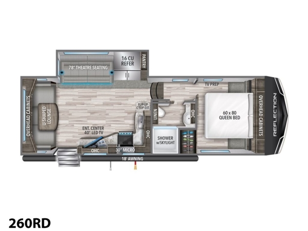 ON DISPLAY AT RIDENORTH KINGSFORD! Laminated Aluminum Framed Construction | Our sidewalls are laminated aluminum framed, but we didn’t stop there like many other manufacturers do…We also laminate the rear wall, and the sidewalls and roof of every slide room. You can feel the difference! Fully Enclosed Underbelly | Our fully enclosed underbelly’s are insulated and have a dedicated heat duct to ensure the best protection from the elements. Ductless Flooring | Heat vents are discretely hidden in the bases of the cabinets, unlike traditional floor vents that trap dirt and debris. Aluminum Entry Steps | High end aluminum steps won’t rust or bind like traditional steel steps. 3-Year Limited Structural Warranty | Class leading construction deserves a class leading warranty. REFLECTION 150-SERIES PEACE OF MIND PACKAGE, ULTIMATE POWER PACKAGE, ARCTIC 4-SEASONS PROTECTION PACKAGE AND SOLAR PACKAGE. GOODYEAR TIRES. SAFERIDE RV ROADSIDE ASSISTANCE. 16 CU FT REFRIGERATOR. 370W SOLAR PANEL UPGRADE. RVIA SEAL. CURT AXLES W/ ABS.