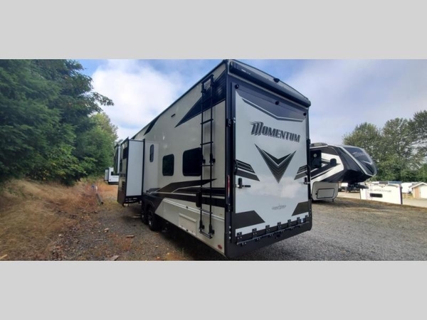 Are you looking for adventure and fun? The Momentum G-Class toy hauler by Grand Design will help you find it! You can explore during any season you choose with the Insulation Package that includes a heated and enclosed underbelly with suspended tanks, a high-capacity furnace, a moisture barrier floor enclosure, and cabinet-mounted heat ducts. Each model includes a 30-gallon fuel station with an interior and exterior gauge, a dovetail rear rend, and 2,500-LB tie-downs anchored into the chassis. Throughout the Momentum G-Class interior, you'll enjoy many comfortable features like large panoramic windows, a shower skylight, USB chargers in the bedroom, and residential cabinetry.