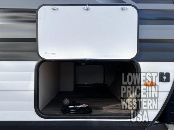Are you ready to camp in comfort with your family or friends? This travel trailer allows you to do just that! There are double-size bunks in the back with step storage for books or board games. There is also a closet here to keep clothes wrinkle-free. The U-shaped dinette within the slide out can be switched out for the optional theatre seats, and the jackknife sofa will be the perfect spot to visit with your crew. This model features a walk-through bath that leads to the front master bedroom. You'll love the queen bed here, overhead storage, and your own exterior entry door for convenience.