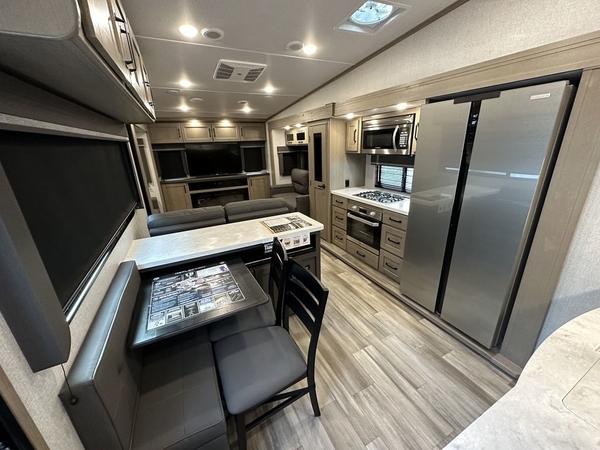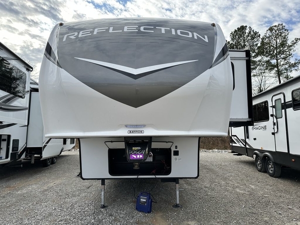 Looking for a separate living area from the kitchen in your next RV? Do you want to be able to entertain while camping? Well this fifth wheel has what you want, plus much more! The rear living area has two opposing tri-fold sofas, and theatre seating directly across from the rear entertainment center with a 50" LED HDTV and a 48" fireplace below it, plus windows and storage. The middle kitchen area offers the cook a large pantry, a 16 cu. ft. refrigerator, and extra counter space around the deep seated stainless steel sink. And there is a free standing adjustable dinette with a storage ottoman and more counter space nearby giving you a place for your things while dining, playing game or even working. The full bathroom can be accessed from the hallway that leads to the front bedroom which offers a queen bed slide or choose a king option, a dresser with window above, plus a full wall wardrobe with a place to add a washer/dryer option to keep everything clean while away. With any Reflection fifth wheels by Grand Design, you will have a 165W solar panel for off-grid camping and a 50 Amp charge controller and inverter prep, a Max Turn radius front cap for easy towing around town and into your campsite, a Universal All-In-One Docking Station, unobstructed pass-through storage, and Goodyear E-rated tires. Some other top features include a chef's kitchen with a 30" stainless steel microwave and residential cooktop, a USB charging station, and the ductless "Evenflow" heating system with no vents in the floor to collect debris. Each is constructed of high gloss gel coat exterior sidewalls, residential 5" truss rafters, walk-on roof decking, a fiberglass and radiant foil roof and front cap insulation plus laminated aluminum framed side walls, rear wall, roof and end walls in slide rooms. Choose luxu