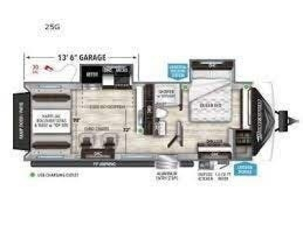 It's time to load up your family and off-road toys to enjoy the great outdoors at the speed you like with this Momentum G-Class toy hauler. Once at your destination, unload the toys from the 13' 6" of cargo space, put out the two slides, and start having fun. You can cook meals in the spacious kitchen area with extra counter space and relax in the Euro chairs or on the rollover sofas with a table. You can even cook at the outside kitchen underneath the 19' power awning. Once it's bedtime, the kids can sleep on the Happi-Jac power bunk or rollover sofas in the main area, and everyone is sure to appreciate the USB charging outlets to keep the electronics up and running just like the fuel station will do for the toys.
