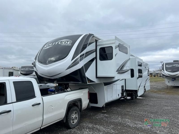 Each Solitude fifth wheel by Grand Design features a 101" wide-body construction, heavy duty 7,000 lb. axles, frameless tinted windows, and high-gloss gel coat sidewalls. You can camp year around thanks to the Weather-Tek Package that includes a 35K BTU high-capacity furnace, an all-in-one enclosed and heated utility center, and a fully enclosed underbelly with heated tanks and storage. Inside, you'll love the premium roller shades, hardwood cabinet doors, solid surface countertops and sinks, plus residential finishes throughout to make you truly feel at home. Each model also includes a MORryde CRE3000 suspension system, self adjusting brakes, and a MORryde pin box that will provide smooth towing from home to campground. Affordable luxury is possible with the Solitude fifth wheels; choose yours today!