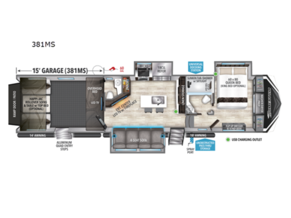 Traveling with friends and family can be comfortable when you have a full double entry bathroom and a half bath available when camping and enjoying the trails on your off-road toys! You will have an 15' garage space that can become a second living/dining area as well as a bedroom if you decide to add the Happi-Jac rollover sofas and a table with a top bed option, plus you can add other options such as an LED TV and/or a washer/dryer. There is an overhead loft bed and a four-seat sofa slide for more sleeping space in the main living area. Everyone can watch the 49" LED TV when waiting for dinner, and enjoy the fireplace on those chiller nights. The kitchen island offers a sink to wash dishes, extra counter space for serving meals and two stools to dine at. The cook will love all the upgraded appliances, and the space thanks to the slide. The front bedroom gives you a queen bed slide or choose a king, lots of clothing space, and a flip-up dresser for even more storage. If you want less garage space, take a look at 351MS-R!