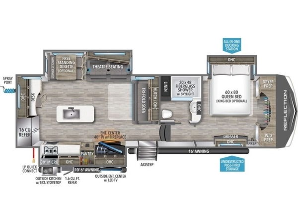 The 320MKS has a free-standing dinette to enjoy those hot meals and family game night as well! This camper was built with the traveling worker in mind with the spacious desk and overhead cabinetry! The living room amenities dont stop there either! There is theater seating and a tri-fold hide-a-bed sofa with storage above!