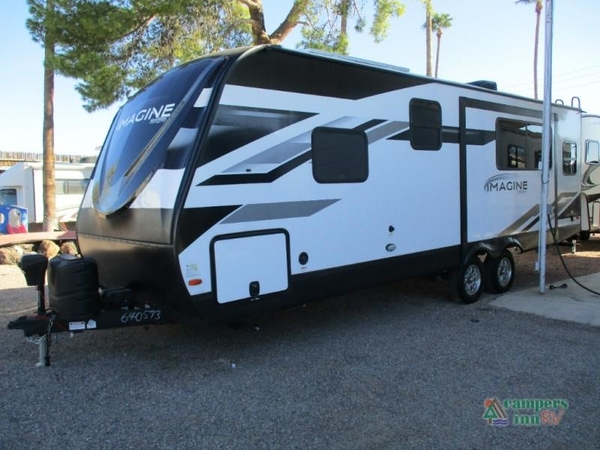 You will have an amazing amount of fun in this Imagine travel trailer! There is a tri-fold sofa and U-shaped dinette with removable ottoman that you can relax on while you watch the LED HDTV, and this trailer has two entry doors so that you can come and go as you please. The private bedroom contains the second entry door, so you can quickly head inside to grab a sweatshirt when you need one. While you're outside, you'll have a 21' power awning to protect you, and there is an exterior coax TV hookup, LP quick connect, and spray port to make your camping life easier. The interior walk-through bathroom connects the bedroom to the rest of the trailer, and the kitchen has a countertop extension so that you can chop veggies on extra counter space.