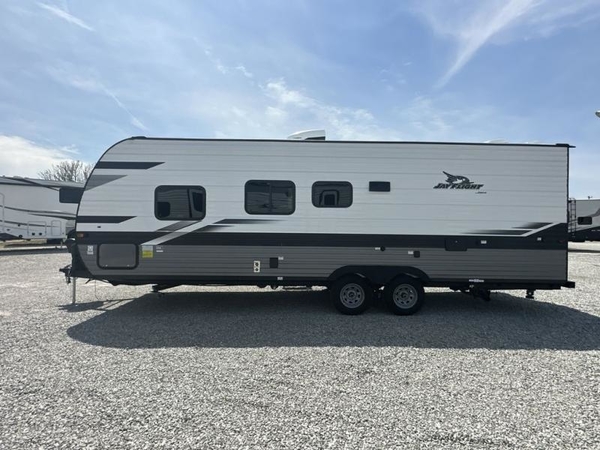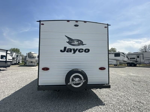 These Jayco Jay Flight travel trailers have been a family favorite for years with their lasting power and superior construction. An integrated A-frame and magnum truss roof system holds them together. When you tow one of these units you're towing the entire unit and not just the frame. With dark tinted windows, you have more privacy and safety. The vinyl flooring throughout will be easy to clean and maintain too. Come find your favorite model today!
