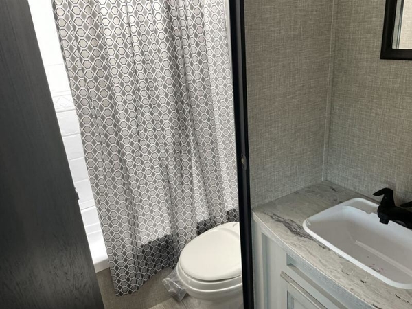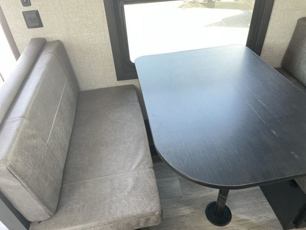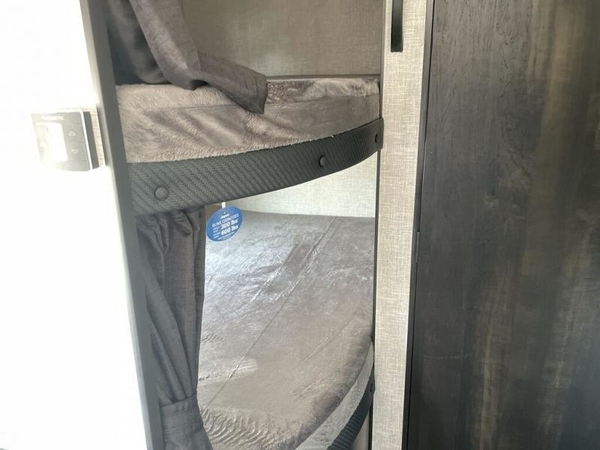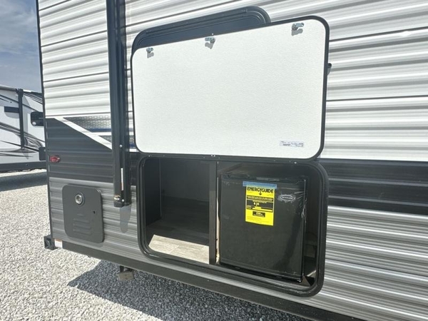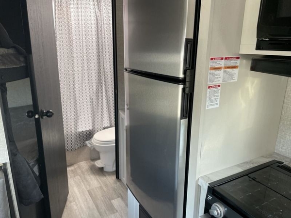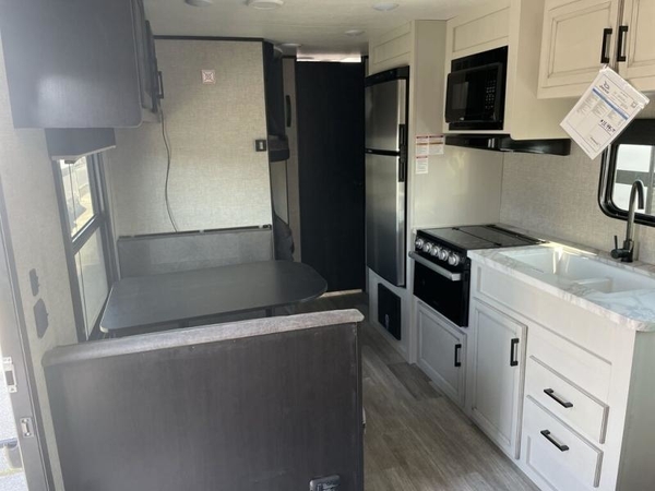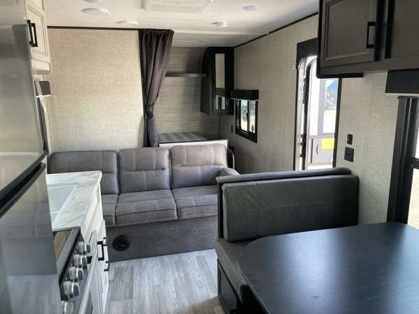 This easy to setup trailer offers a semi-private bedroom up front with a queen bed, semi-private double size bunks in the rear thanks to the curtains, and a private toilet and tub/shower room. The bathroom sink is just outside the door allowing two people to get ready for bed at once. The galley kitchen offers full amenities, and two can dine at the booth dinette and some can relax on the jack-knife sofa. Both furnishings offer extra sleeping space. And you might like to add the Chil N' Stor option which adds a fridge and counter space along the exterior to serve meals outside and store extra beverages.