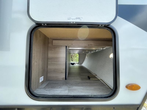 Start looking for your favorite campground to take this travel trailer to! After a fun day at the beach, you can rinse the sand out of your hair with the walk-in shower with a skylight in the full rear bathroom. Depending on what time you enter the unit will determine whether you see the queen Murphy bed or sofa with drawers underneath and wardrobes on either side of it. The booth dinette is not only great for enjoying meals prepared with the two burner cooktop or outside griddle, but also for transforming into an extra sleeping space!
