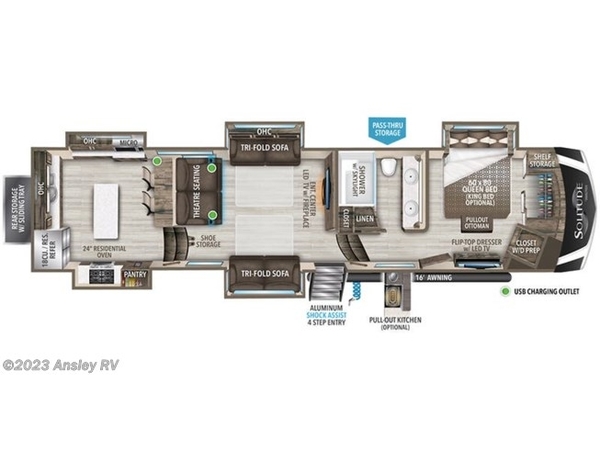 Solar Prep, Central Vacuum System, 20 Cu. Ft. 12V Refrigerator ( + Inverter Prep, 330W Solar Panel, 50 AMP Controller, Bluetooth Module and Two (2) Dock Ports), TV in Bedroom, Electric Fireplace, 12V Tank Heaters, 6 Point Hydraulic Leveling System, Upgraded Cooper H-Rated Tires w/ 17.5" Wheels, SafeRide RV Roadside Assistance, King Bed Upgrade, 3rd A/C - 15K BTU with Heat Pump, Outdoor Kitchen, Slide-Out Awning (5 Slide), Generator Prep, 7K Axle w/ ABS Brakes
