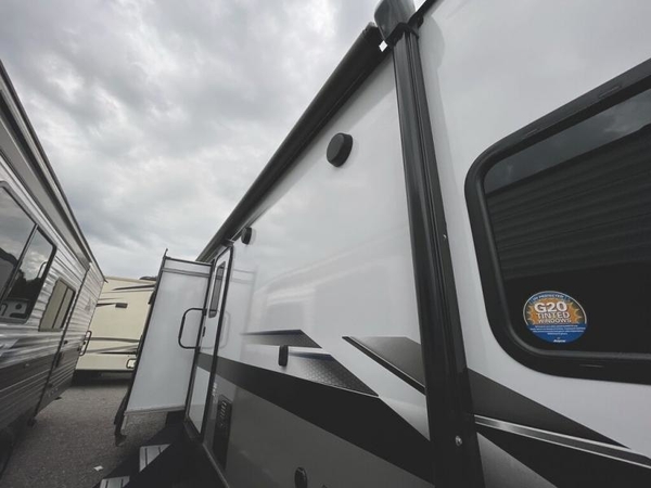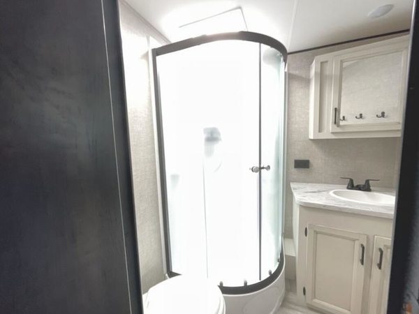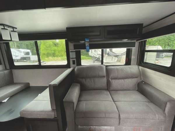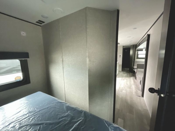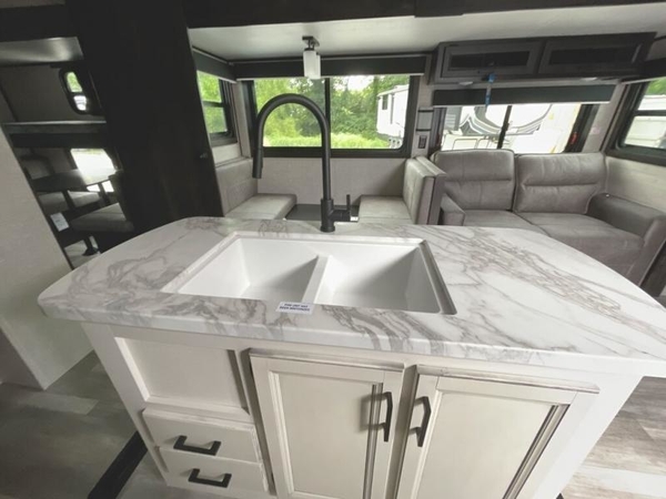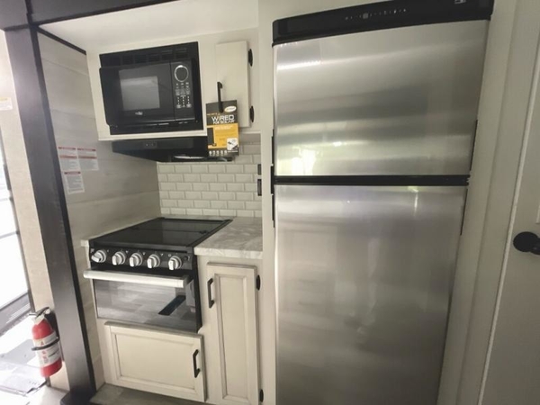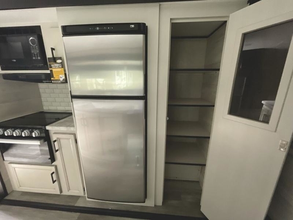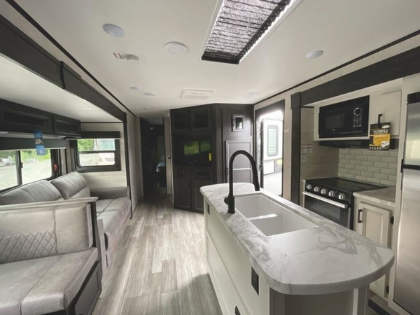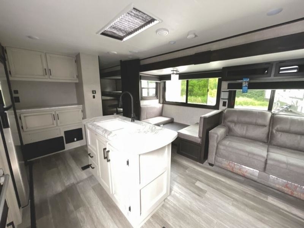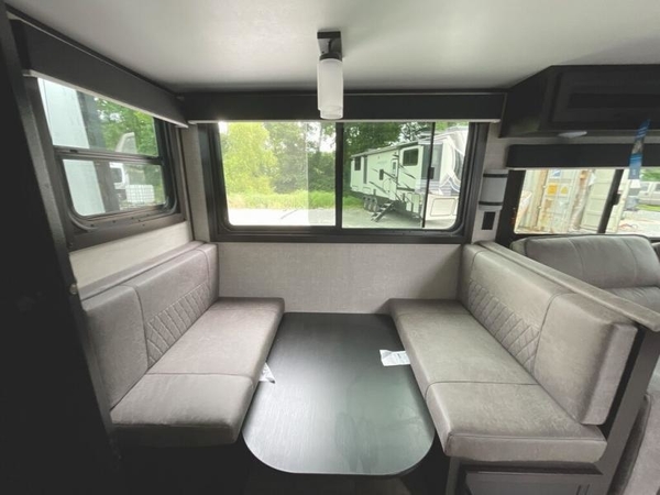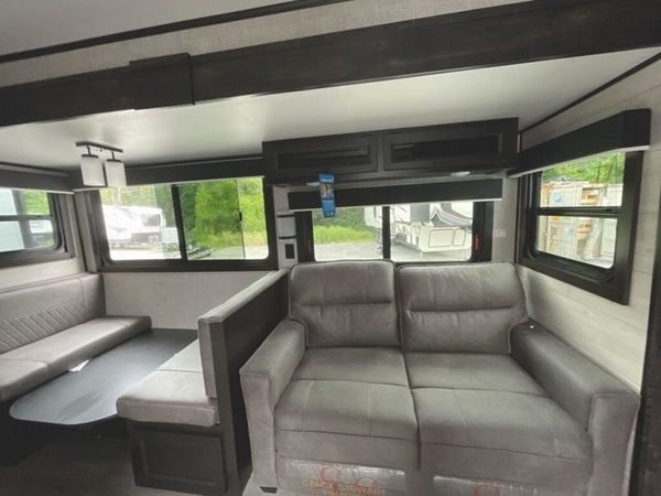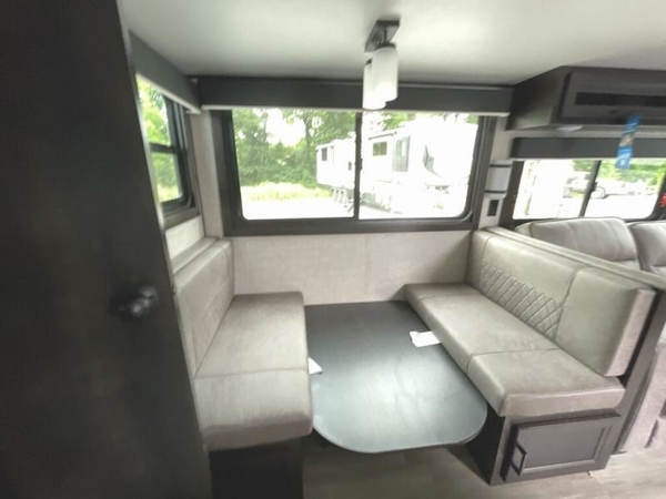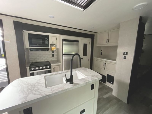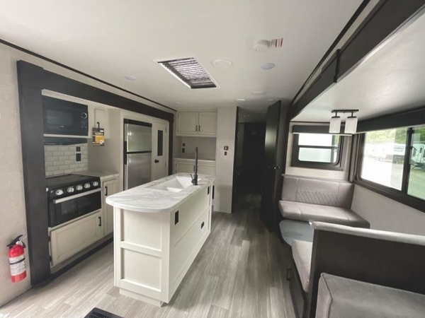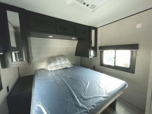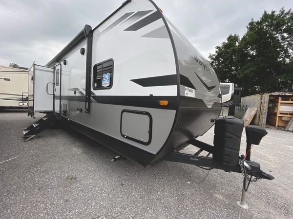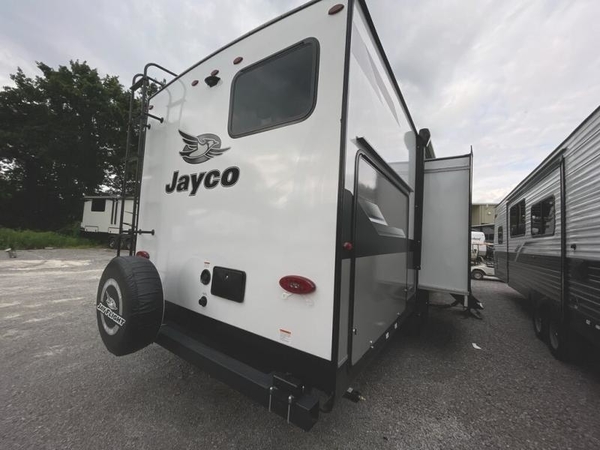 Check out the #1-selling Jayco Jay flight travel trailer! These trailers are built upon I-Class cambered structural steel I-beams and a fully integrated A-frame. They have axles with electric, self-adjusting brakes and easy-lube hubs to make your journeys smooth, and the Magnum Truss roof system will withstand many years and types of travel. You'll have large exterior downspouts, a front diamond plate, four stabilizer jacks, and a friction-hinge entry door with shade-prep window. The interior is where you'll find great comfort and modern design. There are residential-style kitchen countertops, solid hardwood cabinet doors, a premium multimedia sound system, a full-height kitchen backsplash, a kitchen skylight with shade, and a deluxe bedspread with pillows.