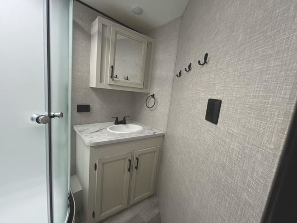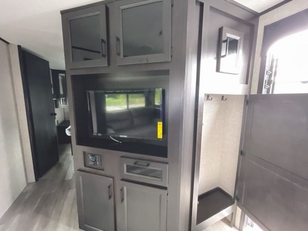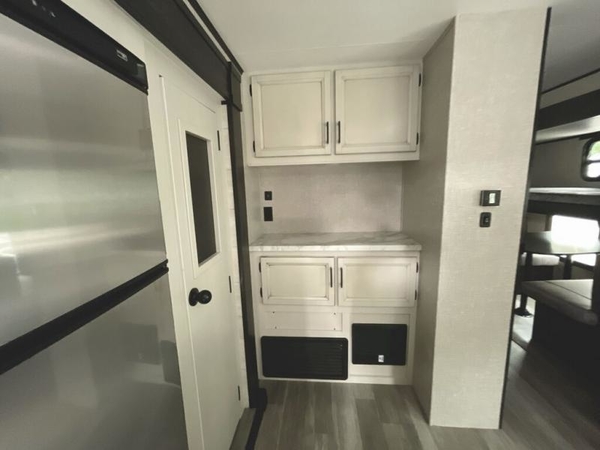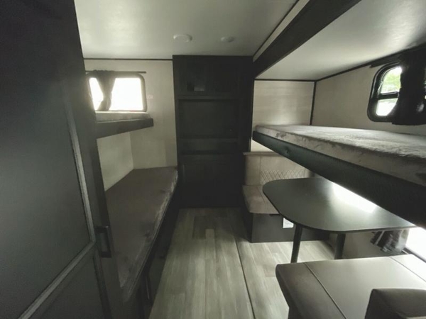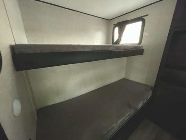 You'll have a grand time getting away with this Jay Flight travel trailer! You'll stay comfortable on the queen-size bed in the front private bedroom, and you can even turn the queen bed into a king by adding the optional king-size bed in its place. When you enter this trailer, there is an entryway closet directly to your right, so you can store coats and shoes easily. The entertainment center gives you the chance to add an optional fireplace below which will make your time spent on the jackknife sofa even more enjoyable. A booth dinette can be used as a dining or sleeping location, and the kitchen hutch will store some dishes for you. The private bunkhouse has the second entertainment center as well as its own dinette and storage area.