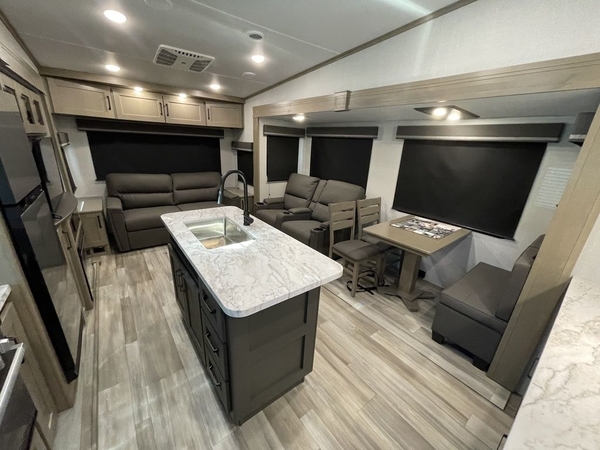 Get ready to enjoy the inside just as much as the outdoors when you have this fifth wheel at the campgrounds. The interior offers a spacious main living and kitchen area thanks to the opposing slides which make walking around the kitchen island easy. The hutch offers more counter and storage space to prepare and serve meals, plus bring extra dishes and such, and the 10 cu. ft. refrigerator will hold your leftovers plus some. Relax on the tri-fold sofa that offers extra sleeping space for guests, and you will love the theatre seats while watching the 40" LED HDTV with fireplace below. There is a full bathroom with a walk-in shower, and the front bedroom allows you to sleep like a queen! With any Reflection 150 Series fifth wheel by Grand Design, there is more available payload capacity and a broader range of half-ton trucks capable of towing this fifth wheel, and no slider hitch is needed thanks to the 90-degree turning radius which makes them short bed friendly and easier to tow. The mandatory Ultimate Power package provides a "One-Touch" automatic leveling system and a detachable power cord with LED light for easy setup, plus motion sensor pass-through lighting and entry lighting, and the Tire Linc TPMS will help you stay safe on the road. The interior offers residential luxury from the cabinetry and gunstock hardware plus the booth dinette to the residential-style window treatment. Make your refined decision today!