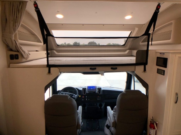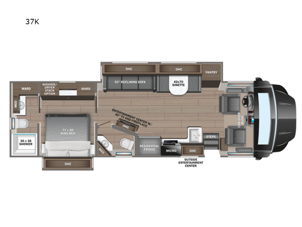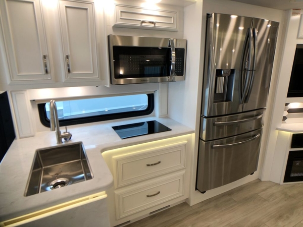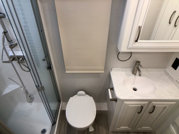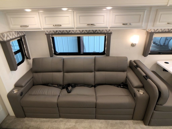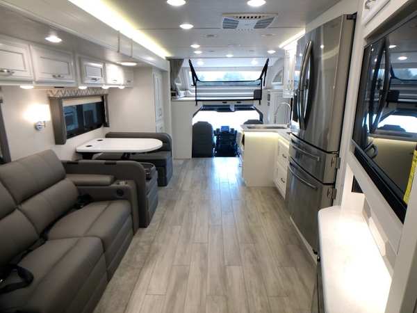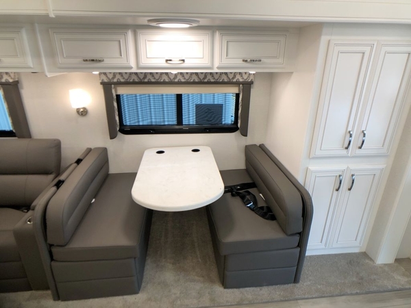 You will be quite impressed with the Jayco Seneca Prestige Super C diesel motorhome! The construction consists of a Stronghold VBL roof, floor, and sidewalls, and the premium Sikkens full-body paint is going to draw attention as you cruise down the highway. The entrance door has the industry's largest travel-view window, and you have four 6V AGM (220Ah) house batteries on a slide out tray for convenience. The JAYCOMMAND control system powered by Firefly will give you access to your coach's functions from the smartphone in your hand, and the high-gloss polished porcelain tile flooring has a heated floor mat for extra comfort. The luxury continues on with the addition of the solid-surface countertops and water filtration system, and the 9" Sony® infotainment center with Apple CarPlay® and Android Auto as well as the backup and sideview cameras are an excellent contribution to the front cab area.