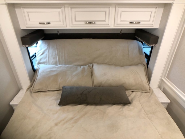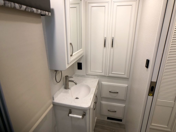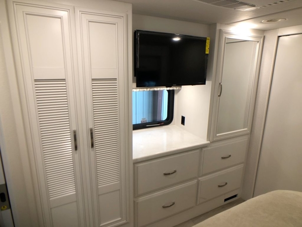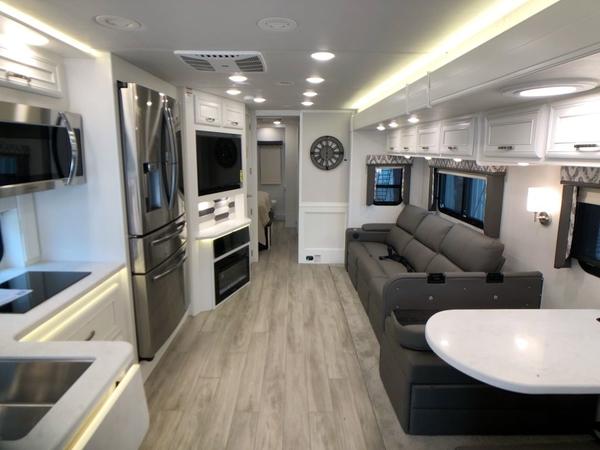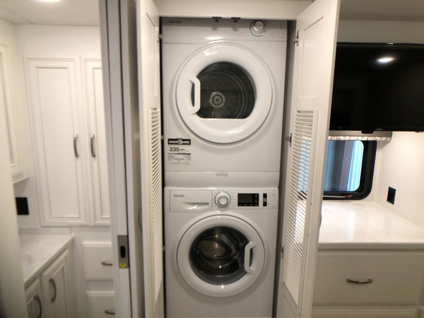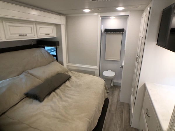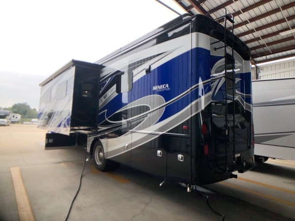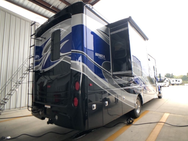 You won't be able to see past the luxury found on this Seneca Prestige Super C diesel motorhome! The first thing that feels ultra glamorous is the master suite which has its very own full bathroom, and the fact that this coach has both a full and a half bathroom will push you towards inviting guests. The main living area is kept spacious when you open up the large slide, and you can also create some more countertop space in the kitchen by opening up the countertop extension. If you want to make fast meals, use the residential convection microwave, and if you want to host a late-night party, set up the exterior entertainment center which comes with an LED TV mounted on a swivel bracket, outside speakers, and an AM/FM radio.
