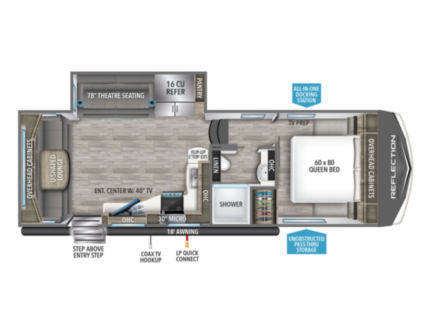 Feel right at home in this Reflection 150 Series with a private bedroom that includes a walk-around queen bed with storage on each side, windows, and a space savings sliding door. The full bathroom offers a walk-in shower, storage for your linens and a sliding door for easy access. When you get hungry, the cook will have an L-shaped kitchen area to make meals, plus full amenities including a 30" microwave, a flip-up counter extension, a pantry for your dry goods and a 10 cu. ft. refrigerator to store lots of food and cold beverages. You can dine at the rear U-shaped dinette lounge and enjoy the view out of all the windows or outside under the 18' electric awning. And the theatre seating will be a nice place to relax and watch the 40" LED HDTV.