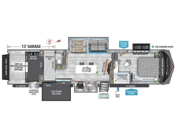 Get ready for a lot of fun when you head out to the off-road park, a special event, or a long trip with your toys! You will love the garage with the Fast Ramp rear ramp door, the Ram-Air garage vents on both sides, the 2,500 lb. rated flush-mount tie-downs and the protective diamond plate on the garage sidewalls. This area can become a bedroom or an extra living area if you want to add Happi-Jac rollover sofas/table with a top bed option, plus you will already have a half bath for convenience, an LED TV and storage for your gear. The living and kitchen area is spacious with dual slides and a kitchen island with bar stools, a free standing table and theatre seating or choose the super sofa option, and everything you need to feed everyone. The fold-down side patio offers an LED TV, storage and a great place to relax outdoors above ground. There are many more features to enjoy, and several options to customize your fifth wheel.