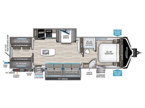 A great travel trailer for larger families or those that enjoy traveling with a few friends! This Imagine quad bunk model features two private bedrooms, with the master up front including a private entry/exit door just beyond a spacious walk-through bathroom that features a 30" x 36" shower with skylight to bring in more natural lighting each day, plus a toilet, sink and linen storage. In the kitchen, a nice island for food prep and cleaning up makes it easy to be part of the conversation in the room while you get meals ready for everyone. Speaking of food prep, how about the outside griddle and 1.6 cu. ft. refrigerator which is perfect for cooking outside, or for making late night snacks when all are enjoying the evening under the stars or in lawn chairs under one of two 9' 6" awnings with LED lighting. Your kids can bring along extra guests with the added sleeping that a quad bunk model provides. And, there is plenty of storage in the private bunkroom with drawers beneath for their things, plus a rear baggage door that is 42" x 22" for even more storage space for extra toys and gear.