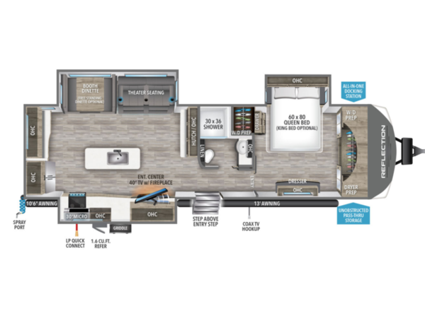 With any Reflection travel trailer by Grand Design, you will have a solar panel for off-grid camping and a 50 amp charge controller and inverter prep, a Universal All-In-One Docking Station, unobstructed pass-through storage, and nitrogen filled radial tires. Some other top features include the 30" stainless steel microwave, the maximum 7-foot headroom, and the ductless heating system with no vents in the floor to collect debris. Each is constructed of gel coat exterior sidewalls, residential 5" truss rafters, walk-on roof decking, a fiberglass and radiant foil roof and front cap insulation plus laminated aluminum framed side walls, roof and end walls in slide rooms. Choose luxury, value, and towability over all the others, take home a Reflection of your good taste!