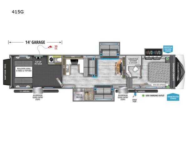 A 14' separate garage in this toy hauler offers plenty of space for your off-road toys! You will appreciate the convenience of having a full bathroom with sunken tub and you can even add an optional half bath to the garage area. You will also appreciate the two entry doors, and flip-up pet dish. The rear ramp door can even be converted into a patio, plus there are exterior speakers to keep the party going. Everyone will love hanging out in the separate living area with a fireplace at the entertainment center, two theater seating slides, and a third theater seating. The fully equipped kitchen has everything you need to prepare delicious home cooked meals. The front private bedroom offers an escape to rest and relax on a queen bed for the next ride, plus you have access to the dual entry bathroom!