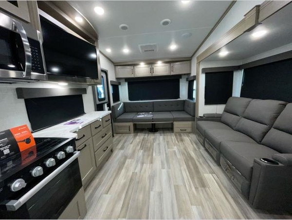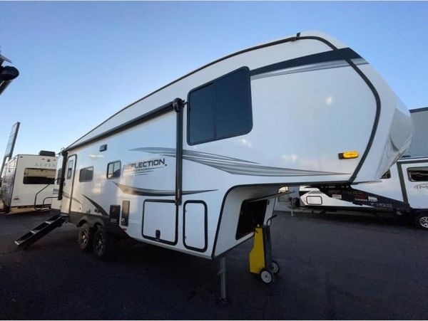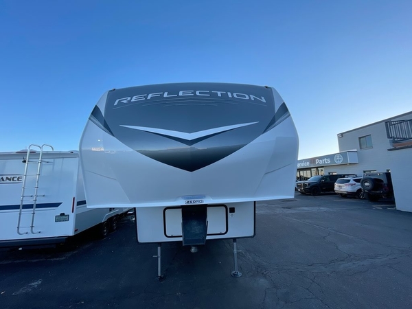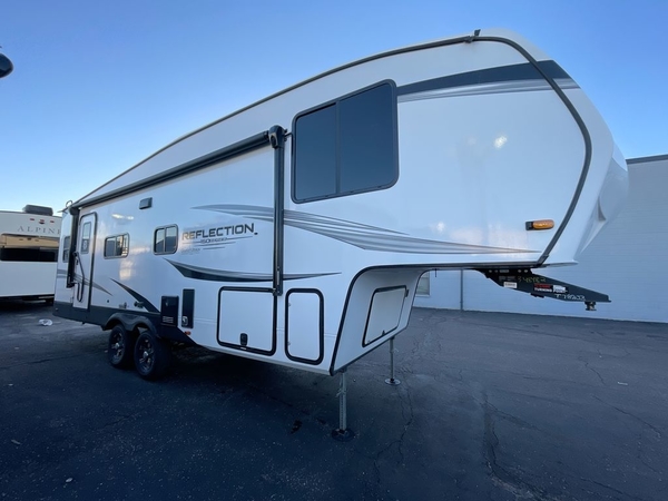 With any Reflection 150 Series fifth wheel by Grand Design, there is more available payload capacity and a broader range of half-ton trucks capable of towing this fifth wheel, and no slider hitch is needed thanks to the 90-degree turning radius which makes them short bed friendly and easier to tow. The mandatory Ultimate Power package provides a "One-Touch" automatic leveling system and a detachable power cord with LED light for easy setup, plus motion sensor pass-through lighting and entry lighting, and the Tire Linc TPMS will help you stay safe on the road. The interior offers residential luxury from the cabinetry and premium congoleum flooring, plus the booth dinette to the residential-style window treatment. Make your refined decision today!
