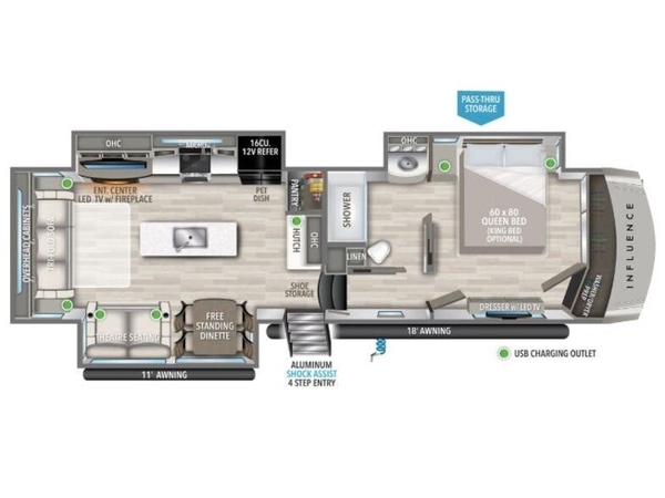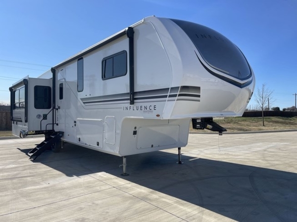 Any Grand Design Influence fifth wheel features five-sided aluminum cage construction with a walk-on roof and a fully enclosed underbelly with heated tanks and storage for all weather camping. For peace of mind, the MORryde CRE3000 Suspension system and ABS braking system will provide safe and smooth towing, and the 101" widebody construction offers all the room you need and that is before multiple slides are fully engaged. You will appreciate the keyed alike locks, slam-latch baggage doors with magnetic door catches, exterior security light, and solid surface entry steps. On the inside, Congoleum flooring, premium roller shades for privacy, a hallway handrail for safety, and nightstands with USB ports to keep all of your electronics fully charged. You will also love the On Demand tankless water heater when showering, plus the added heat and ambiance from an electric fireplace, and so much more!
