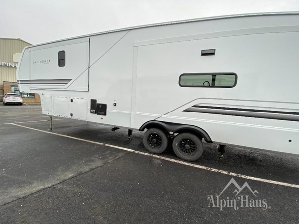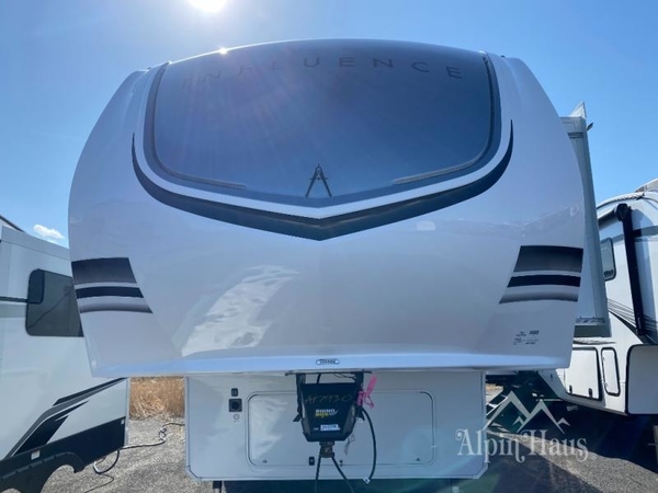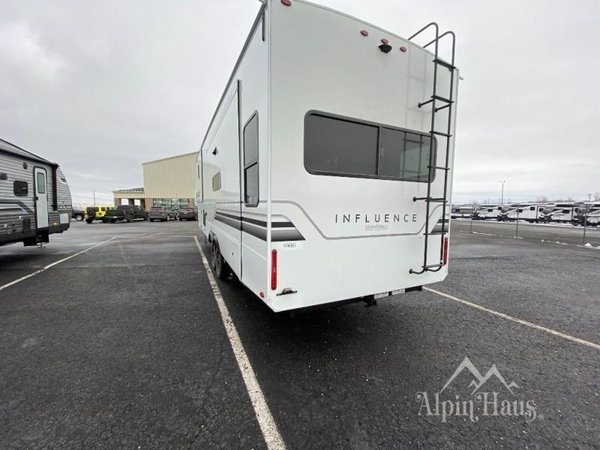 Any Grand Design Influence fifth wheel features five-sided aluminum cage construction with a walk-on roof and a fully enclosed underbelly with heated tanks and storage for all weather camping. For peace of mind, the MORryde CRE3000 Suspension system and ABS braking system will provide safe and smooth towing, and the 101" widebody construction offers all the room you need and that is before multiple slides are fully engaged. You will appreciate the keyed alike locks, slam-latch baggage doors with magnetic door catches, exterior security light, and solid surface entry steps. On the inside, Congoleum flooring, premium roller shades for privacy, a hallway handrail for safety, and nightstands with USB ports to keep all of your electronics fully charged. You will also love the On Demand tankless water heater when showering, plus the added heat and ambiance from an electric fireplace, and so much more!