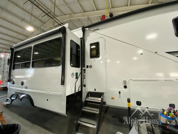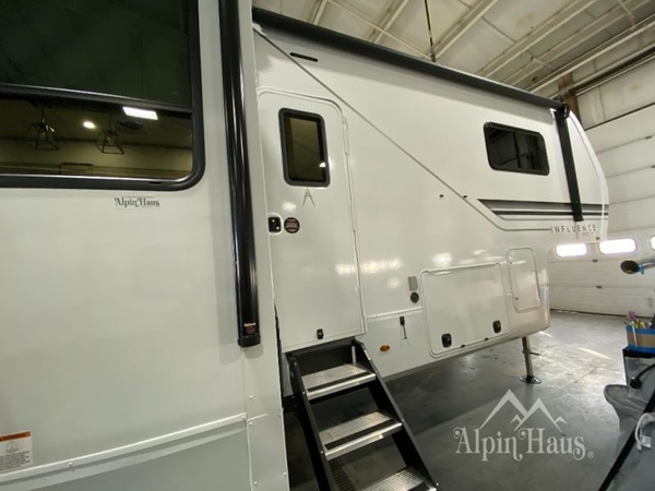 Any Grand Design Influence fifth wheel features five-sided aluminum cage construction with a walk-on roof and a fully enclosed underbelly with heated tanks and storage for all weather camping. For peace of mind, the MORryde CRE3000 Suspension system and ABS braking system will provide safe and smooth towing, and the 101" widebody construction offers all the room you need and that is before multiple slides are fully engaged. You will appreciate the keyed alike locks, slam-latch baggage doors with magnetic door catches, exterior security light, and solid surface entry steps. On the inside, Congoleum flooring, premium roller shades for privacy, a hallway handrail for safety, and nightstands with USB ports to keep all of your electronics fully charged. You will also love the On Demand tankless water heater when showering, plus the added heat and ambiance from an electric fireplace, and so much more!