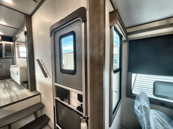 Five slide outs, a full bathroom with dual sinks, a half bath off of the kitchen and a separate front living and entertainment area are a few reasons you will enjoy your time spent in this fifth wheel! The separate kitchen is a dream with the stainless steel appliances including a 24" residential oven, an oversized pantry, a hutch with counter space, a kitchen island plus a free-standing dinette slide with windows for great views. The entertainment center offers an LED Smart TV with a fireplace below and storage, and the dual opposing tri-fold sofas provide sleeping space. The walk-through bedroom includes a queen bed, LED TV and storage, plus space savings sliding doors that lead you to the rear full bathroom with dual sinks, linen storage and space prepped for a washer/dryer option. You will find more storage throughout the fifth wheel in the overhead cabinets, the entry closet, and under the interior steps for shoes. The exterior has several storage choices including the pass-through compartment for fishing poles and such, plus the unique sliding tray in the rear allows you to bring along the larger items such as camping tables, portable grills, golf clubs, totes and such.