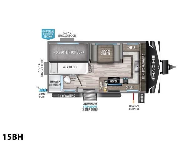 2024 Grand Design Imagine AIM 15BHImagine AIM expands the lineup with floorplans starting under 3,600-pounds. AIM welcomes even more of today's SUVs, without the compromise that other manufacturers feel forced to make in pursuit of lighter weight.Features may include:ExteriorBackup Camera Prep80% Tint Radius Safety Glass Windows20 lbs LP Bottles (2)Radius Entry DoorHigh-Capacity Water PumpBattery Kill Switch (Pass Thru)Extra Large 2 Fresh Water Drain ValveOversized Tank CapacitiesInteriorSolid Drawer FrontsSolid Core Cabinet StilesPre-Drilled and Screwed Face FramesBall Bearing Full Extension Drawer GlidesLarge Panoramic Window78" Interior CeilingTelescoping Dinette TableResidential CountertopsMicrowave2-Burner Cook TopDouble Door RefrigeratorStainless Steel SinkResidential BedspreadMaster Suite with Queen Bed Residential Walk-In ShowerSkylight Over ShowerPower Vent Fan