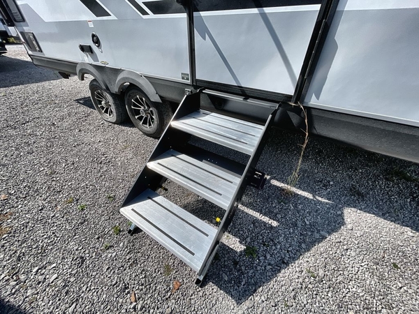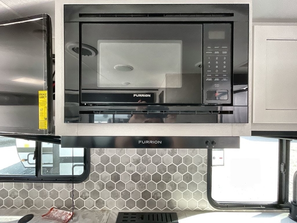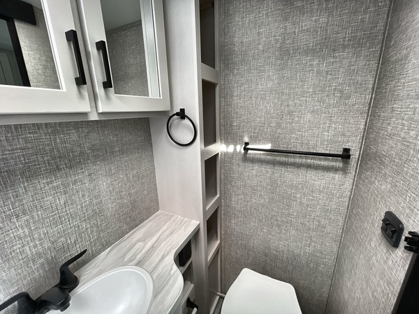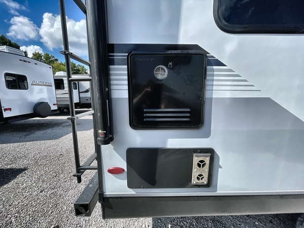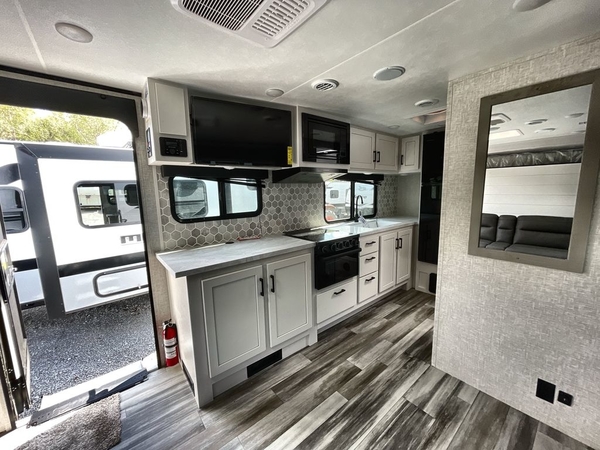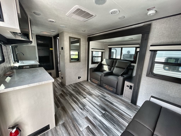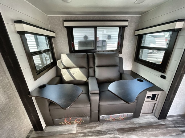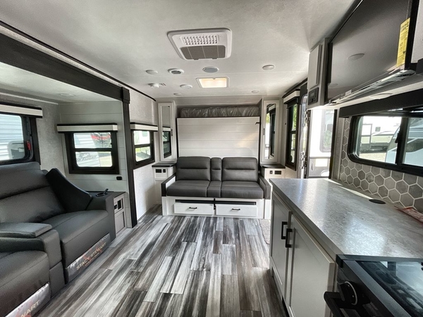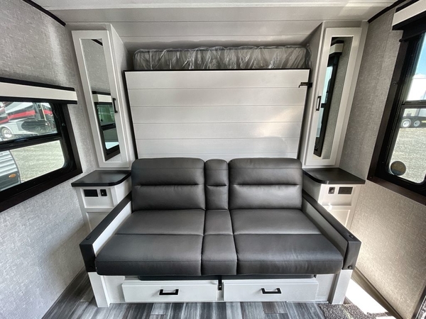 This travel trailer offers a lot of possibilities! During the day, relax in the spacious front living area, with a jackknife sofa plus a pair of theater seats, both positioned for a great view of the entertainment center. A fully equipped kitchen with dual sinks, microwave, and residential three-burner oven makes meals easy, and the theater seats have swing-out trays for you to dine. At night pull down the 60" x 75" Murphy bed for a great night's sleep! wardrobes on either side of the bed provide plenty of storage for your clothing. The rear corner bath is convenient and private, and offers a linen closet plus a medicine cabinet for additional storage capability. Outside you will be sheltered from the sun beneath the 15' awning.