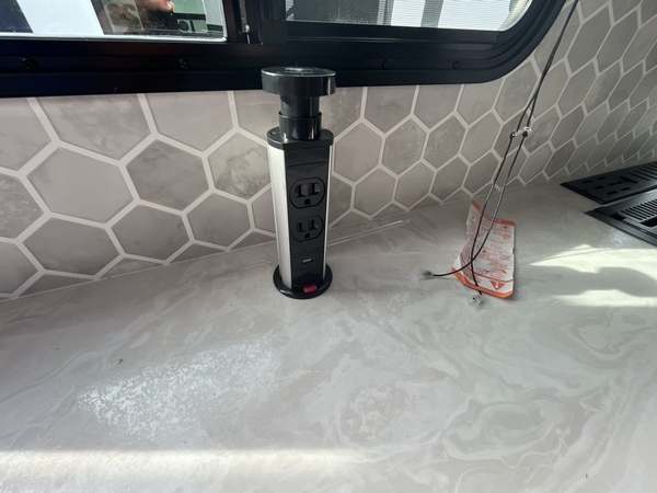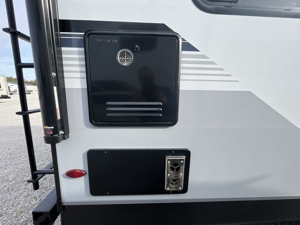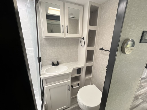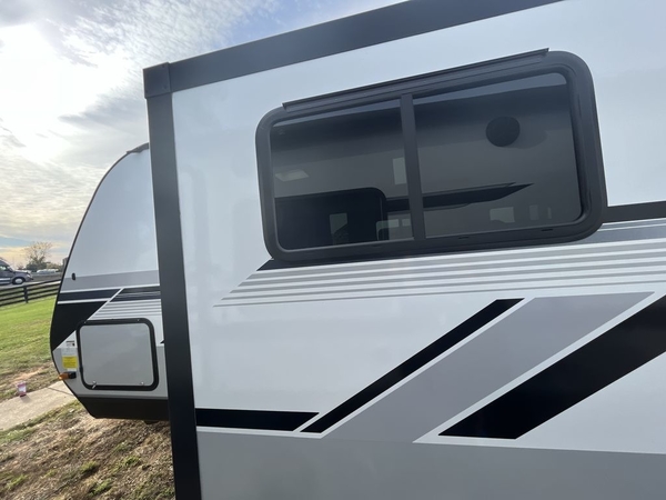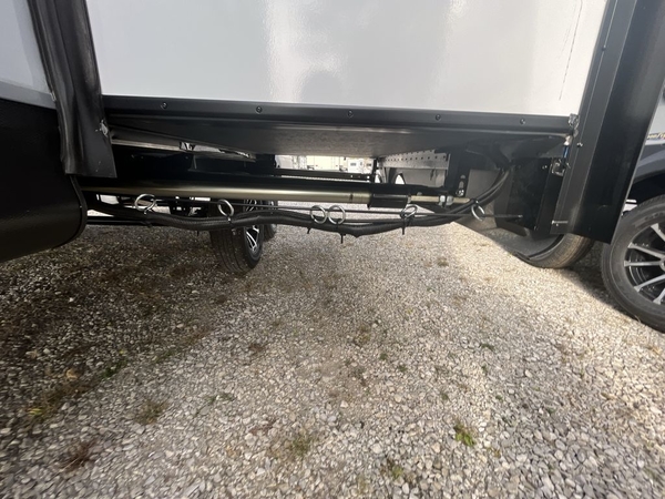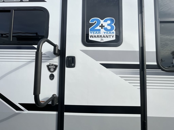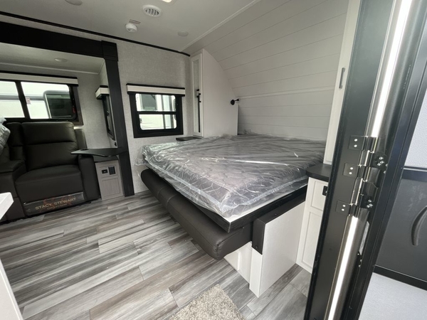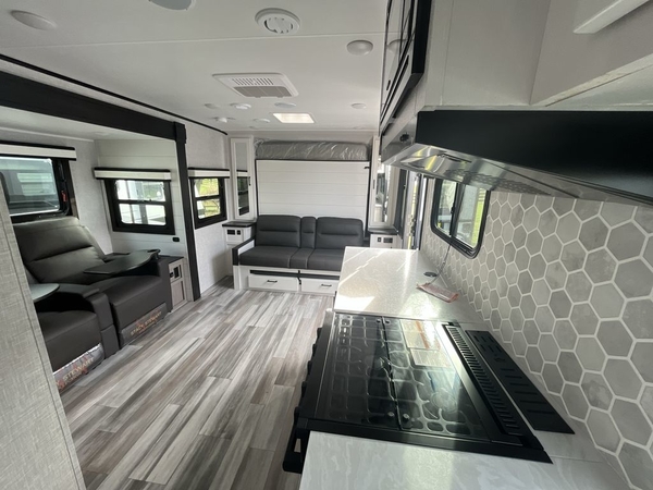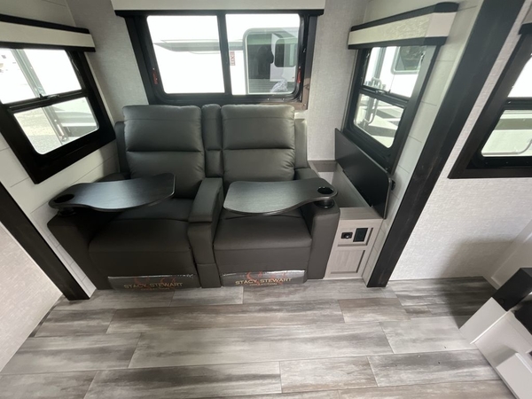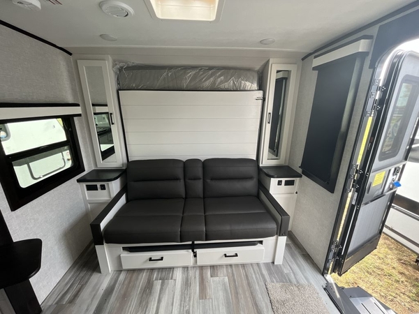 This travel trailer offers a lot of possibilities! During the day, relax in the spacious front living area, with a jackknife sofa plus a pair of theater seats, both positioned for a great view of the entertainment center. A fully equipped kitchen with dual sinks, microwave, and residential three-burner oven makes meals easy, and the theater seats have swing-out trays for you to dine. At night pull down the 60" x 75" Murphy bed for a great night's sleep! wardrobes on either side of the bed provide plenty of storage for your clothing. The rear corner bath is convenient and private, and offers a linen closet plus a medicine cabinet for additional storage capability. Outside you will be sheltered from the sun beneath the 15' awning.