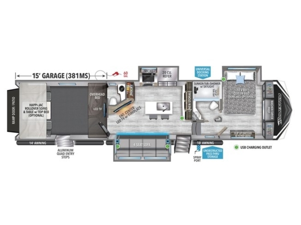 Outside there is an unobstructed pass-through storage area, an 18' awning over the front half of the fifth wheel, an optional 14' awning over the garage area, plus more! Call McClains RV for more information or stop by!