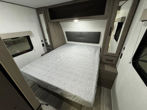 Your search for the perfect couple's trailer is over with this RV in tow! You will enjoy your own private bedroom up front with a queen bed, overhead storage, and TV prep if you choose to bring along your own television. The spacious full rear bath includes a linen closet and a walk-in shower to easily clean up each day. Relax on the theatre seating after a long day outdoors, or you can choose the optional EZ Glide sofa if you need additional sleeping space. The booth dinette can also be used for an overnight guest or two little ones. This model also includes plenty of storage space and plenty of counter space to prep and cook at-home meals!