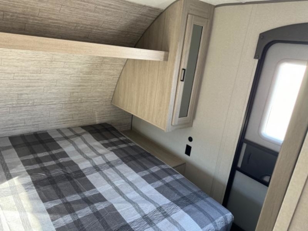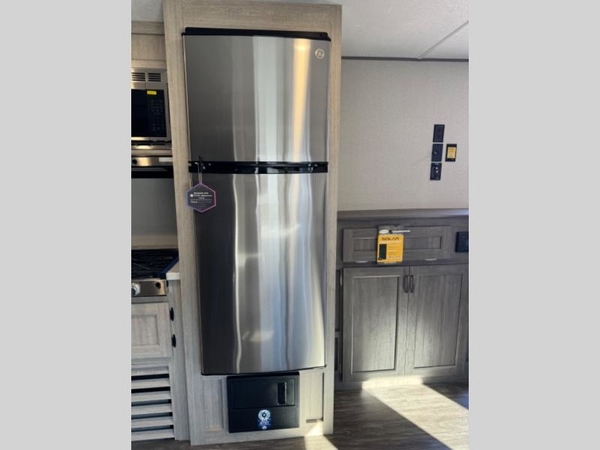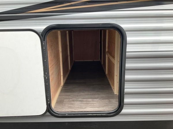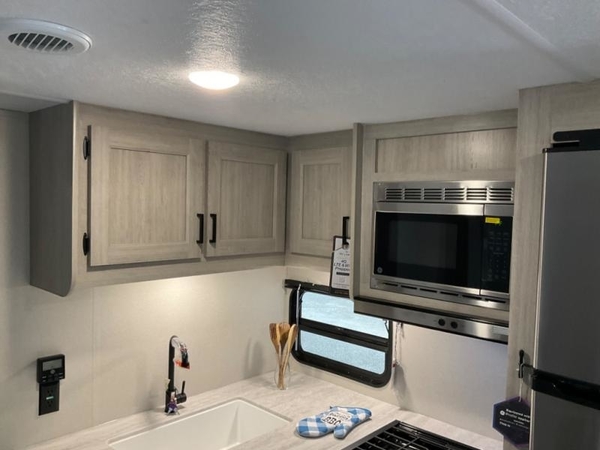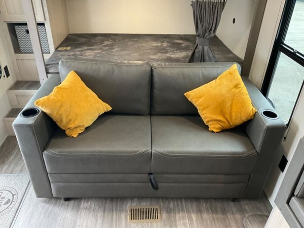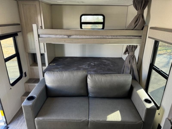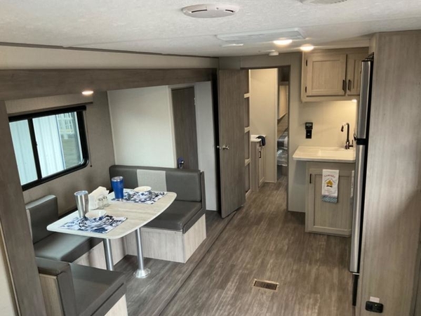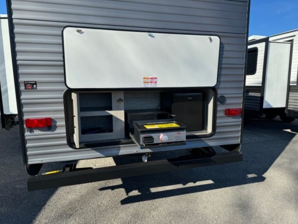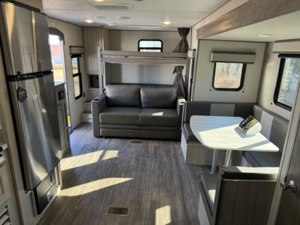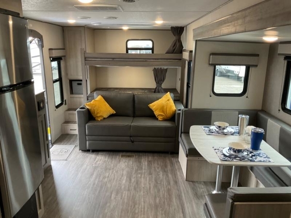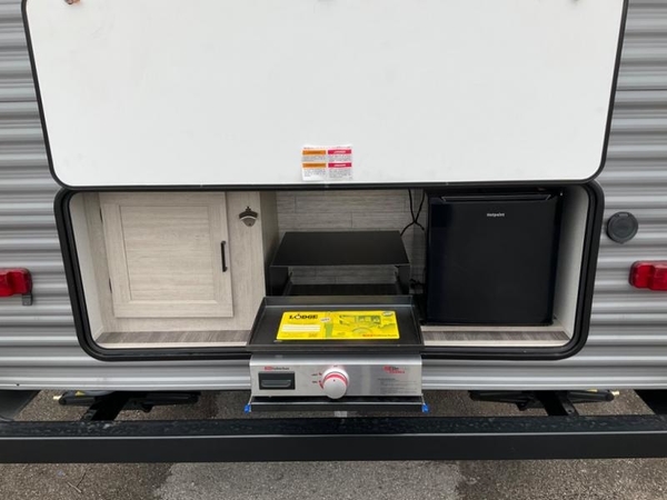 Life is easier in this travel trailer with dual entry doors! One of the entrances leads directly into the front private bedroom which has a queen bed with wardrobes on either side to hang your clothes. The second entrance is right by the double bed bunks behind the 68" sofa. The walk-through bathroom has a tub/shower with skylight above for a shower with a view when you look up. The living area has everything you need for a cozy evening indoors on the sofa by the entertainment center or you can play a few card games at the U-shaped dinette. Cook a sunrise breakfast at the outside camper kitchen with the pull out griddle, a cabinet for storage, and a refrigerator for cold orange juice!
