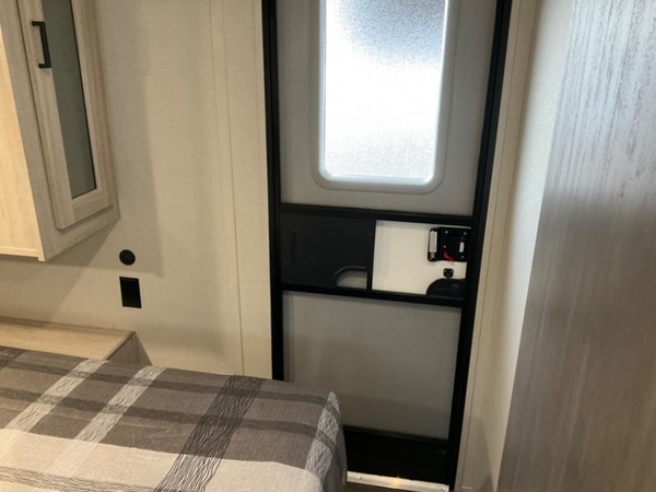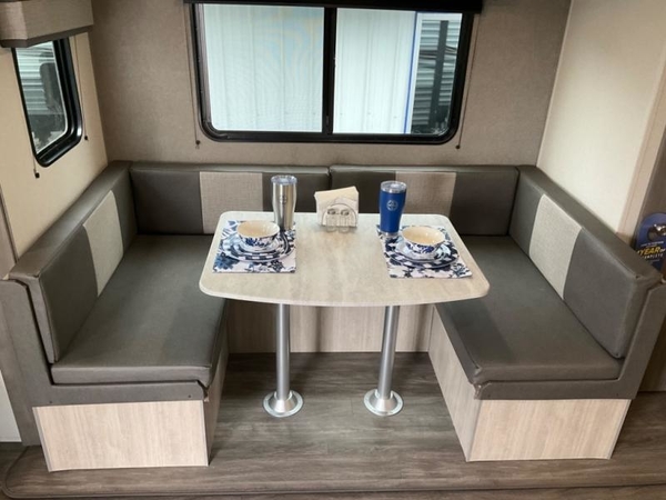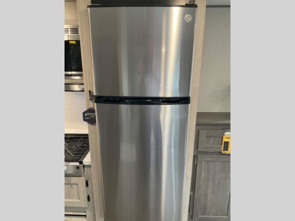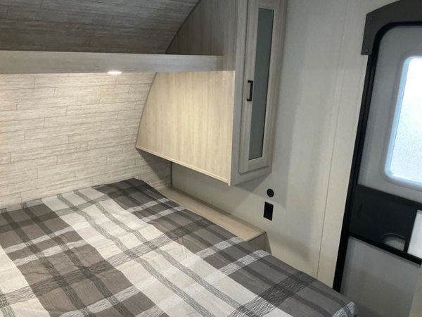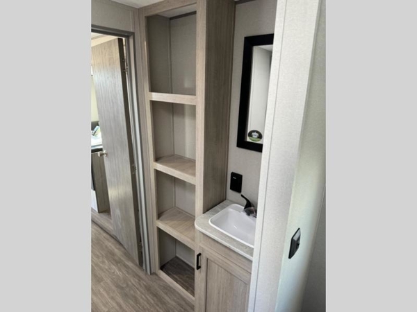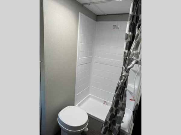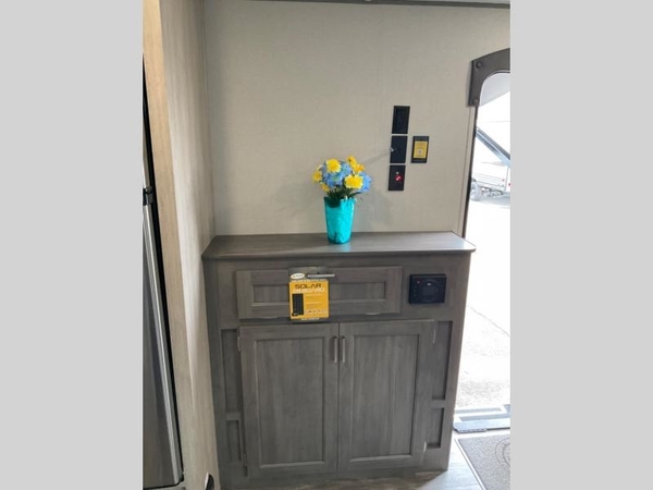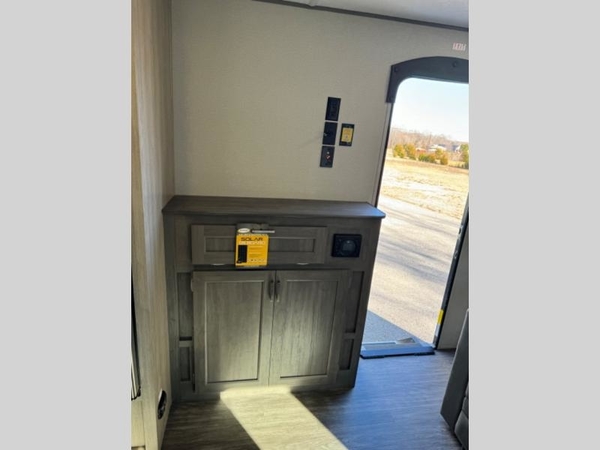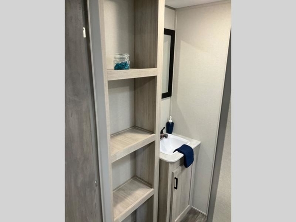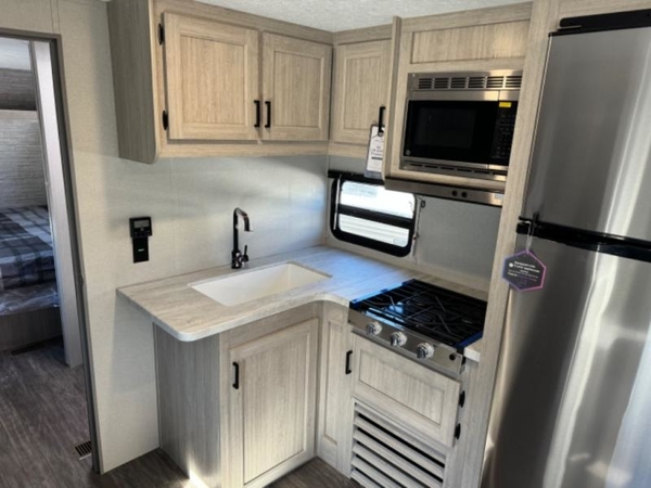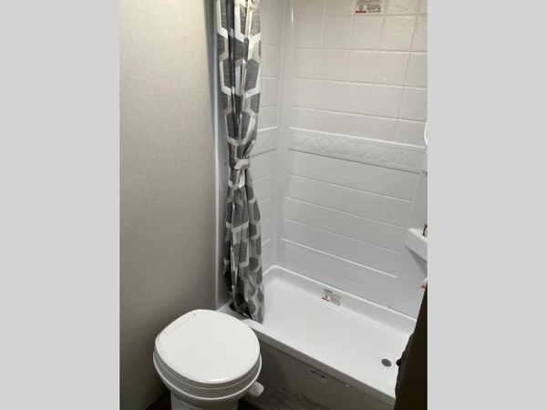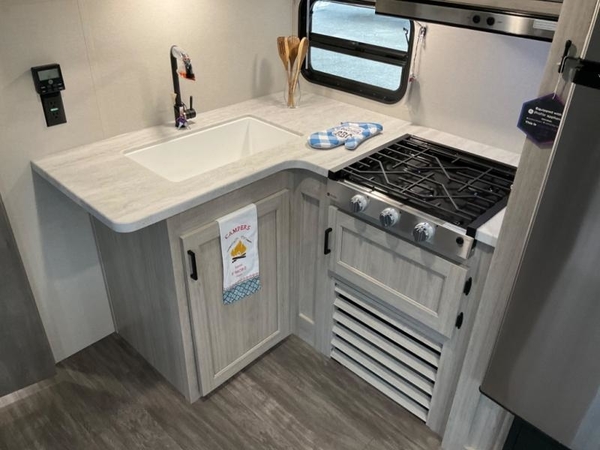 Life is easier in this travel trailer with dual entry doors! One of the entrances leads directly into the front private bedroom which has a queen bed with wardrobes on either side to hang your clothes. The second entrance is right by the double bed bunks behind the 68" sofa. The walk-through bathroom has a tub/shower with skylight above for a shower with a view when you look up. The living area has everything you need for a cozy evening indoors on the sofa by the entertainment center or you can play a few card games at the U-shaped dinette. Cook a sunrise breakfast at the outside camper kitchen with the pull out griddle, a cabinet for storage, and a refrigerator for cold orange juice!