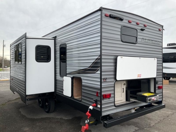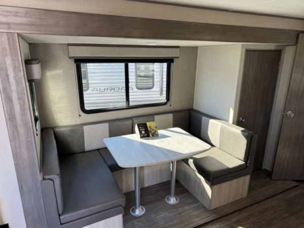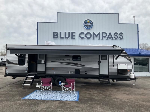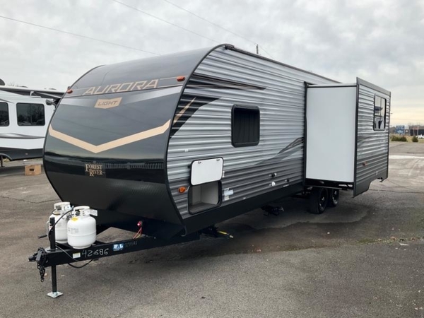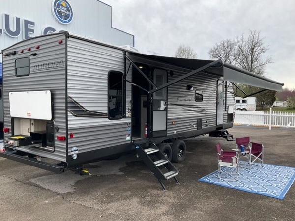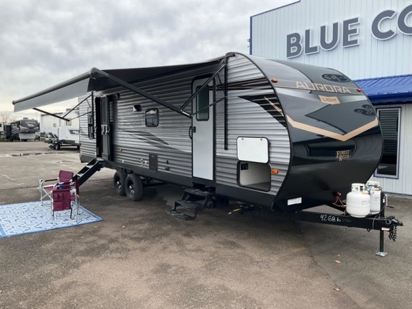 Comfortability, usability, and quality is what you will find in each one of these Forest River Aurora travel trailers, toy haulers or destination trailers! They are designed with a superior build and packed full with industry leading, functional, and distinctive standard features. SolidStep entrance steps and a Safe-T rail door assist on main entry door to help you safely enter and exit the unit. The diamond plate rock guard will protect your unit from road debris and the nitrogen filled radial tires, which keep their pressure longer, offer better fuel economy. You will also find upgraded JBL Elite exterior speakers outside, an electric awning with multicolor lights and remote, plus flush mount baggage doors for easy packing. The interiors are beautifully designed with a deep undermount farm style sink, stainless steel appliances, and linoleum flooring throughout which will be easy to clean. Come find your favorite model today!