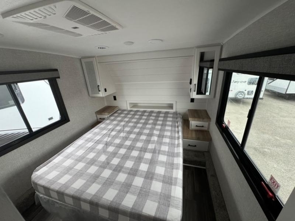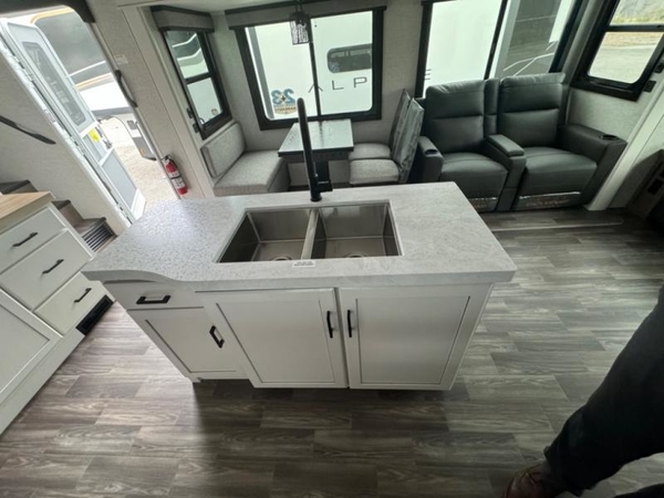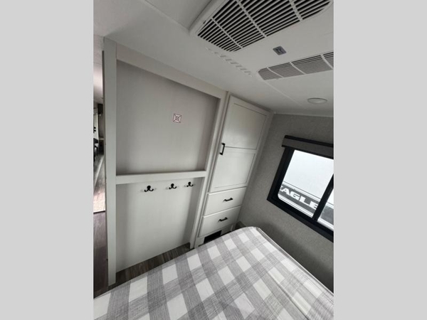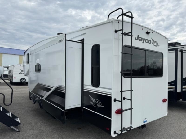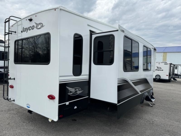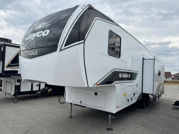 With any Eagle HT fifth wheel by Jayco you will enjoy a smooth drive thanks to the 4 Star Handling Package, Goodyear Endurance tires, and MORryde CRE-3000 rubberized suspension. The Customer Value Package includes amenities that are sure to make camping easier than ever, like the 60K on-demand water heater, Keyed-Alike lock system, electric awning with integrated LED lights, and more. Handcrafted and glazed door/drawer fronts will make your space feel more like home, along with residential vinyl flooring throughout, motion activated LED lights, and blackout roller shades with reflective side throughout to keep the sun out when you want to sleep in. The HELIX Cooling System features Jayco's exclusive insulated dual duct design, directional and closeable A/C vents, and larger return air vents with user friendly filters to keep your crew comfortable all summer long. Choose an entry-level Eagle HT fifth wheel today!
